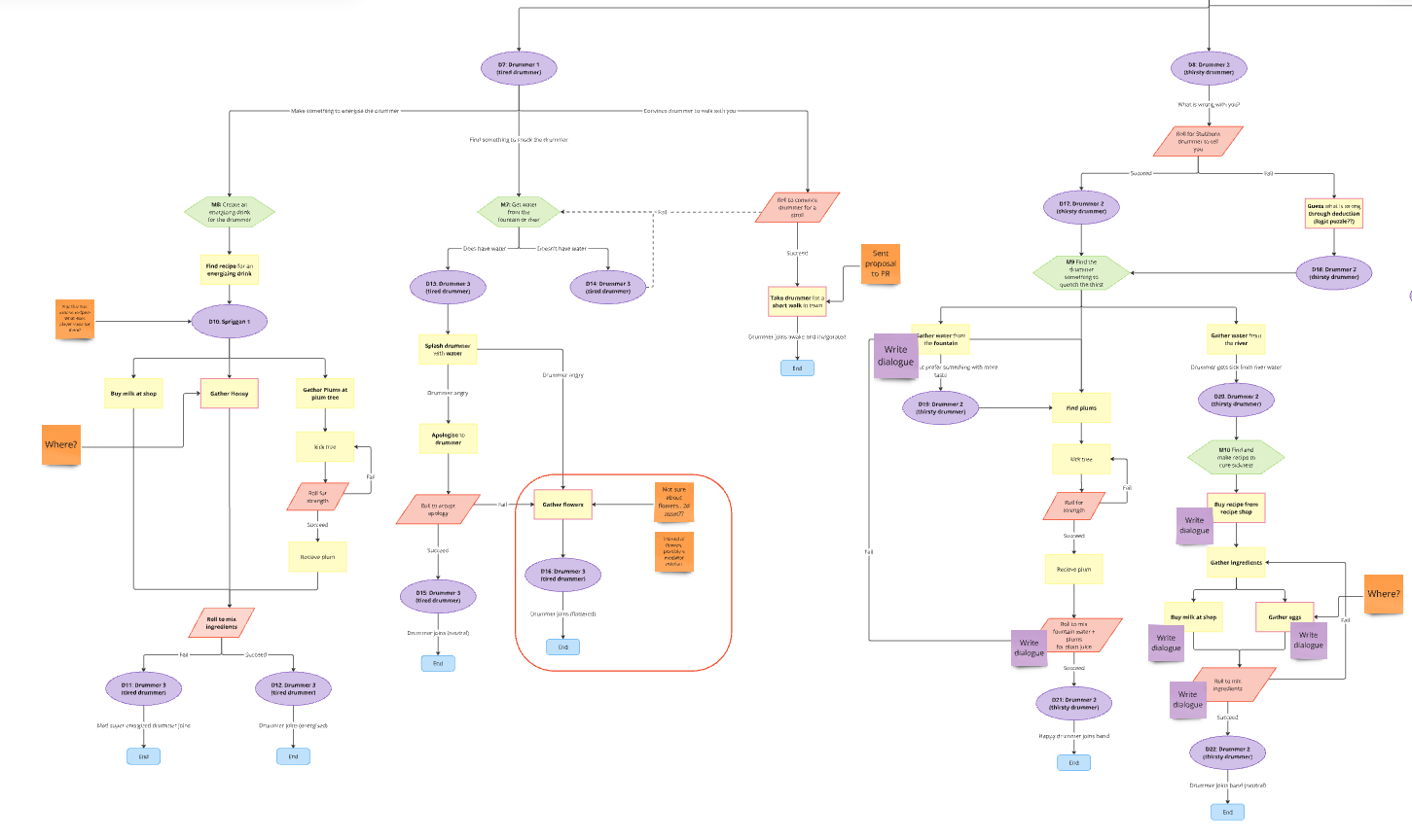 Here you can see one of the examples of the above mentioned pipelines. The image below is part of what I provided the narrative design team with, as they did not have a documentation pipeline for mission design yet. I provided them with a simple template of a mission graph with specific symbols and colours for things such as dialogue and mission objective updates. From that point onwards the narrative designers created mission breakdowns for each designed mission, as can be seen by the mission graph example. This significantly improved the speed and efficiency at which mission were able to be designed and implemented, and improved the communication within the narrative design team.