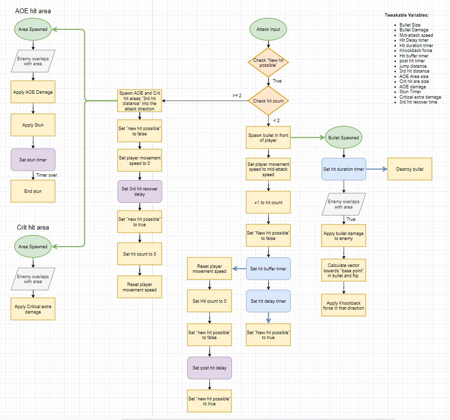 The implementation phase of the weapon, enemy and other features started with the creation of a detailed feature breakdown graph. These graphs broke down each features functionality as much as possible, guiding me along the implementation process, making it as easy and efficient as it could be.